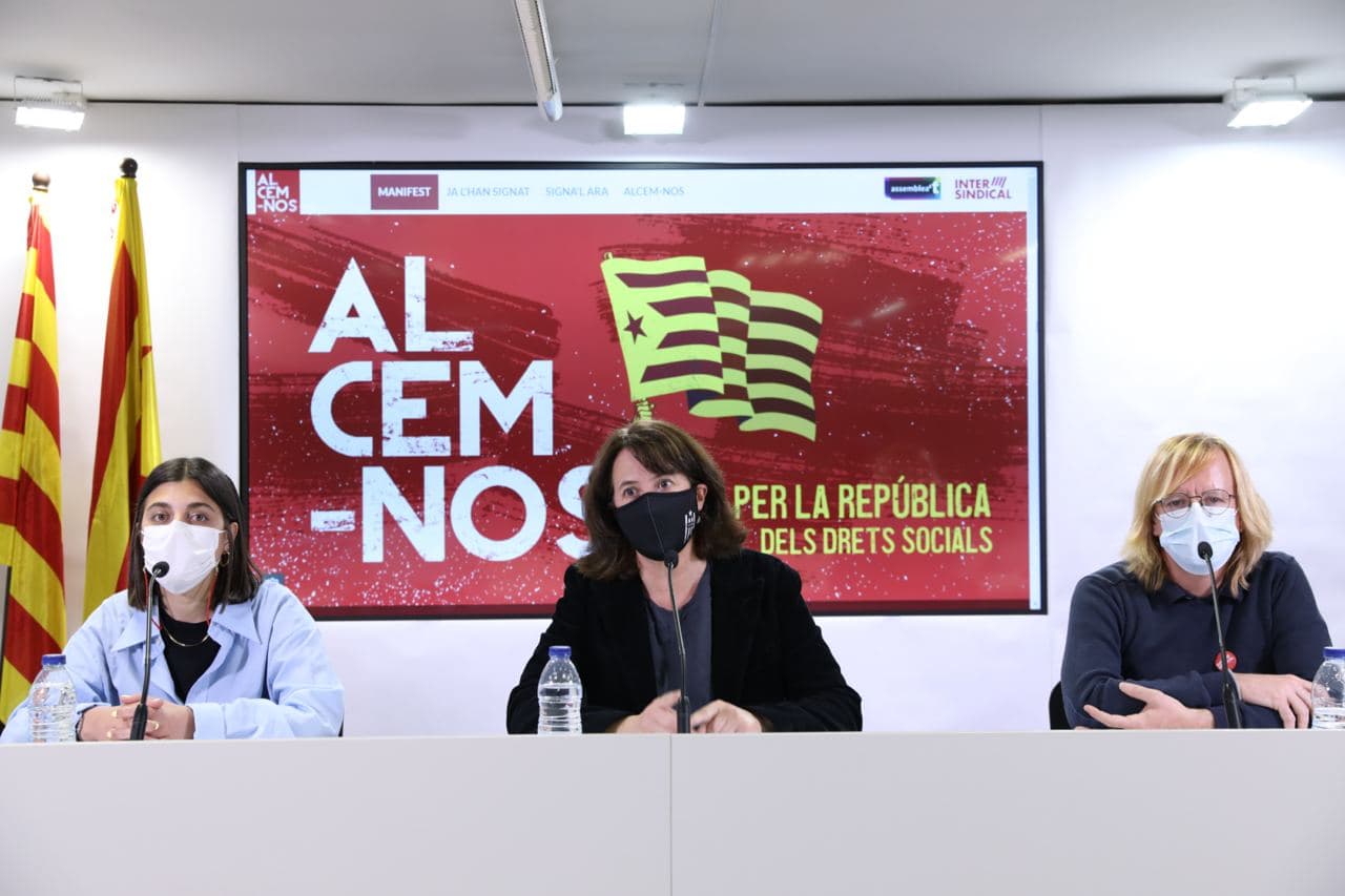 A la roda de premsa de presentació hi han participat la presidenta de l’Assemblea, Elisenda Paluzie; el secretari general de la Intersindical-CSC, Sergi Perelló, i l’alliberada i afiliada a la Intersindical Anna Pagès.