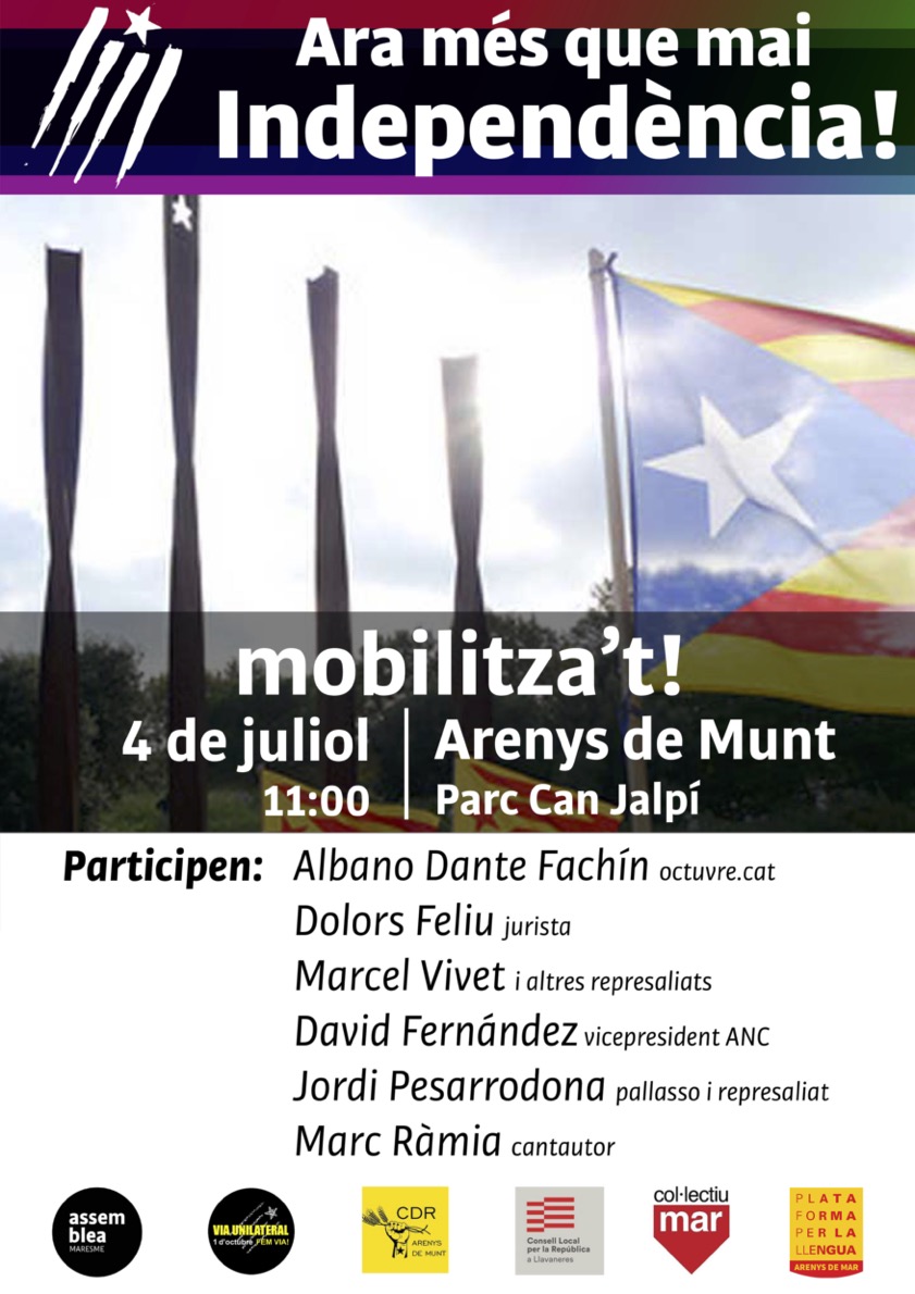 Diumenge 4 de juliol, a les 11:00 del matí, les Assemblees del Maresme organitzen un acte polític a Arenys de Munt, per deixar ben clar que ni la pandèmia, ni la repressió, ni els interessos partidistes ens han fet desistir del nostre objectiu: Ara més que mai, independència!