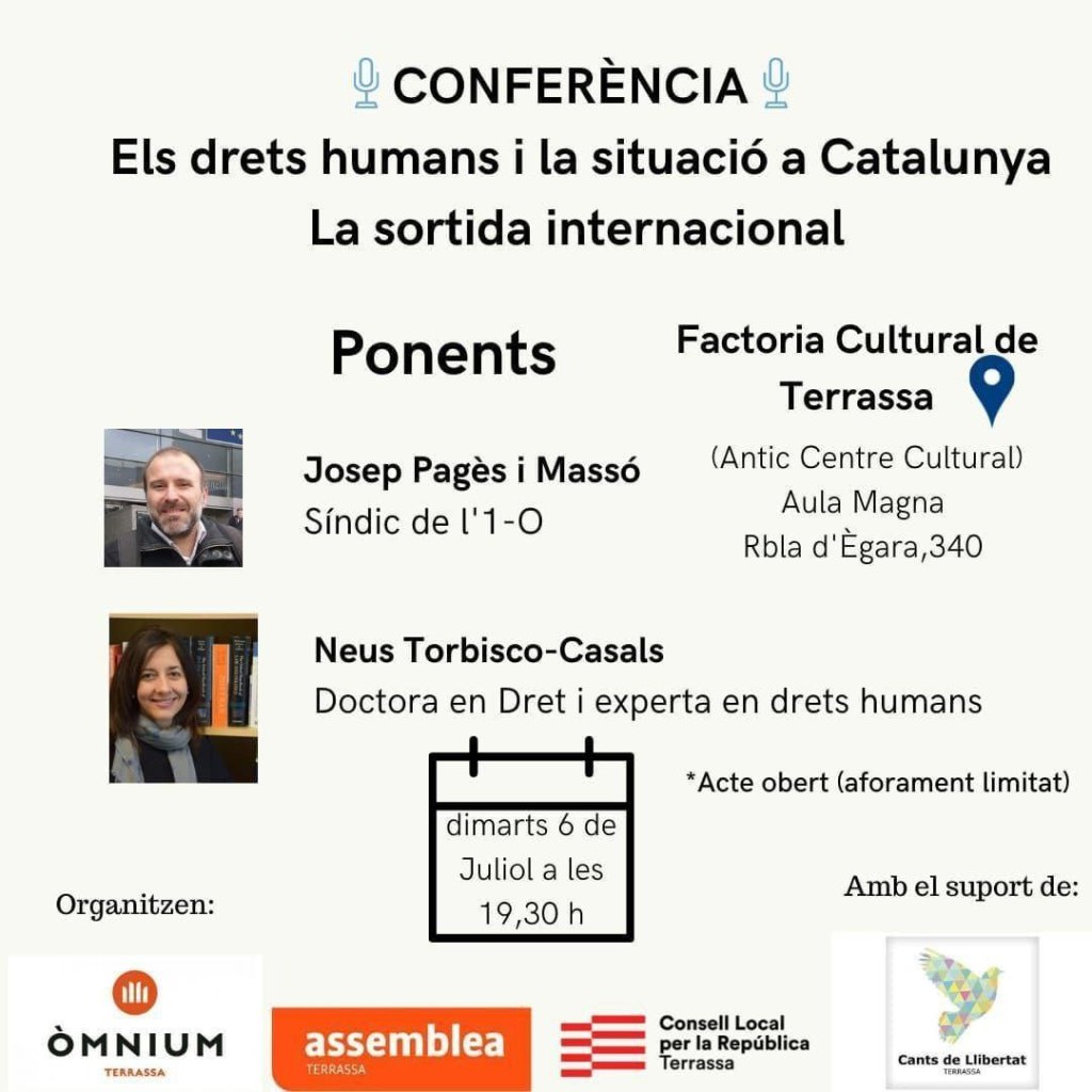 El dimarts 6 de juliol, a Terrassa, es farà la conferència “Els drets humans i la situació a Catalunya. La sortida internacional“.