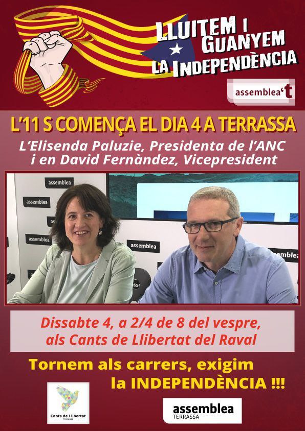 ag. 31 2021 El 4 de setembre, a Terrassa, l’Elisenda Paluzie i el David Fernàndez seran als Cants de Llibertat El dissabte 4 de setembre, a Terrassa, la presidenta de l’Assemblea Nacional Catalana, Elisenda Paluzie i el vicepresident, David Fernàndez, seran als Cants de Llibertat. L’acte serà a les 19.30 al Raval. Feu clic per enviar un enllaç per correu electrònic a un amic (S'obre en una nova finestra) Correu electrònic Feu clic per compartir al Facebook (S'obre en una nova finestra) Facebook Feu clic per compartir a X (S'obre en una nova finestra) X Feu clic per compartir al WhatsApp (S'obre en una nova finestra) WhatsApp Feu clic per compartir al Telegram (S'obre en una nova finestra) Telegram Feu clic per compartir al Mastodon (S'obre en una nova finestra) Mastodon Més Feu clic per imprimir (S'obre en una nova finestra) Imprimeix Fes clic per compartir al Linkedin (S'obre en una nova finestra) LinkedIn Feu clic per compartir al Tumblr (S'obre en una nova finestra) Tumblr Feu clic per compartir al Pinterest (S'obre en una nova finestra) Pinterest Fes clic per compartir al Reddit (S'obre en una nova finestra) Reddit Feu clic per compartir al Pocket (S'obre en una nova finestra) Pocket M'agrada S'està carregant...