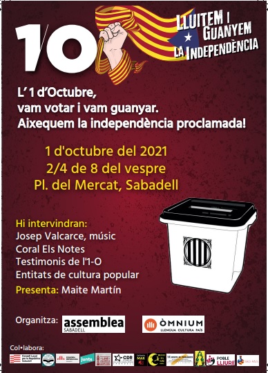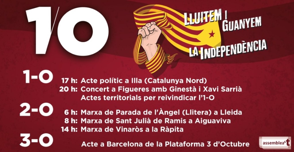 El dissabte 2 d’octubre es duran a terme tres marxes simultànies per reivindicar l’1 d’Octubre i la independència, dues de les quals començaran en altres territoris dels Països Catalans. Cada una conclourà amb un acte polític.