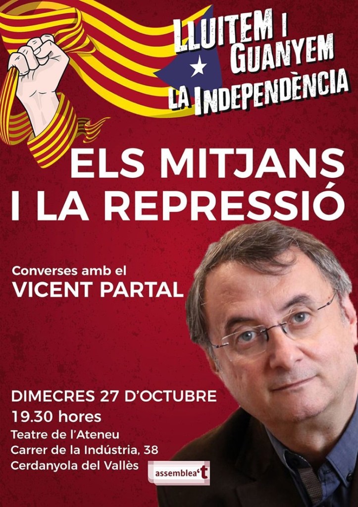 El dimecres 27 d’octubre, a Cerdanyola del Vallès, el director de Vilaweb, Vicent Partal parlarà sobre els mitjans de comunicació i la repressió. L’acte coincidirà en el dia que va fer-se la declaració d’independència al Parlament de Catalunya, fa quatre anys.