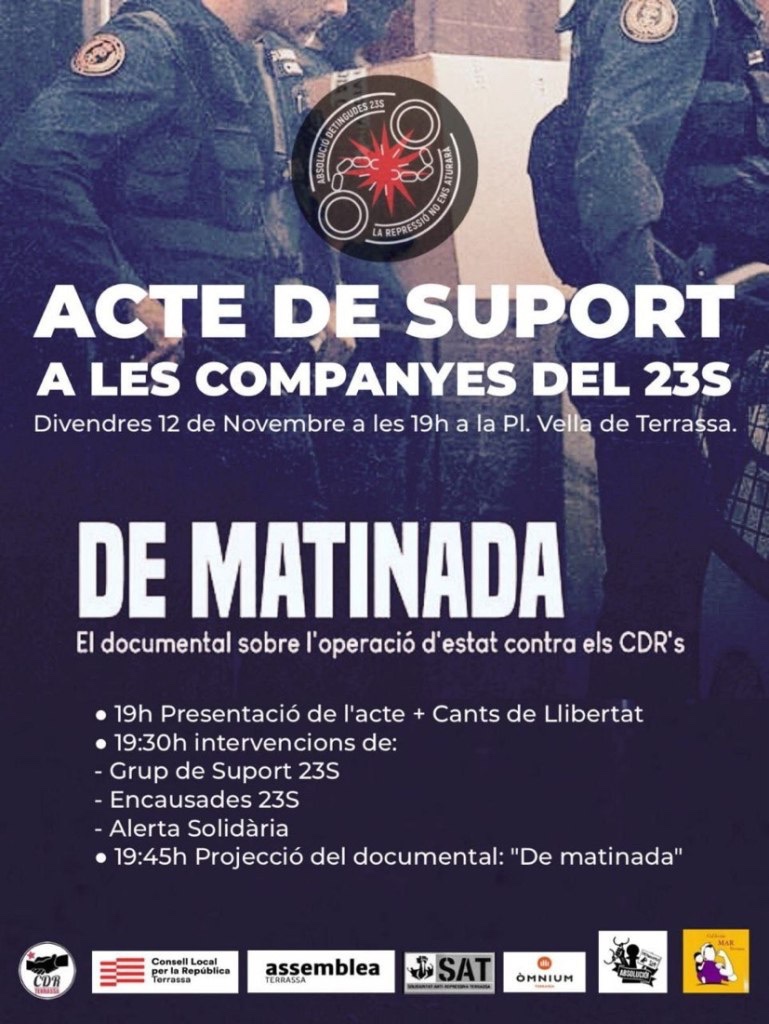 El divendres 12 de novembre, a Terrassa, es farà una acte en suport a les persones represaliades pel cas 23S.