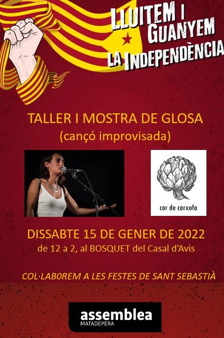 TALLER I MOSTRA DE GLOSA, l’art centenari d’improvisar versos sobre melodies. Amb els components del grup Cor de Carxofa sentirem glosar i aprendrem com fer-ho.
