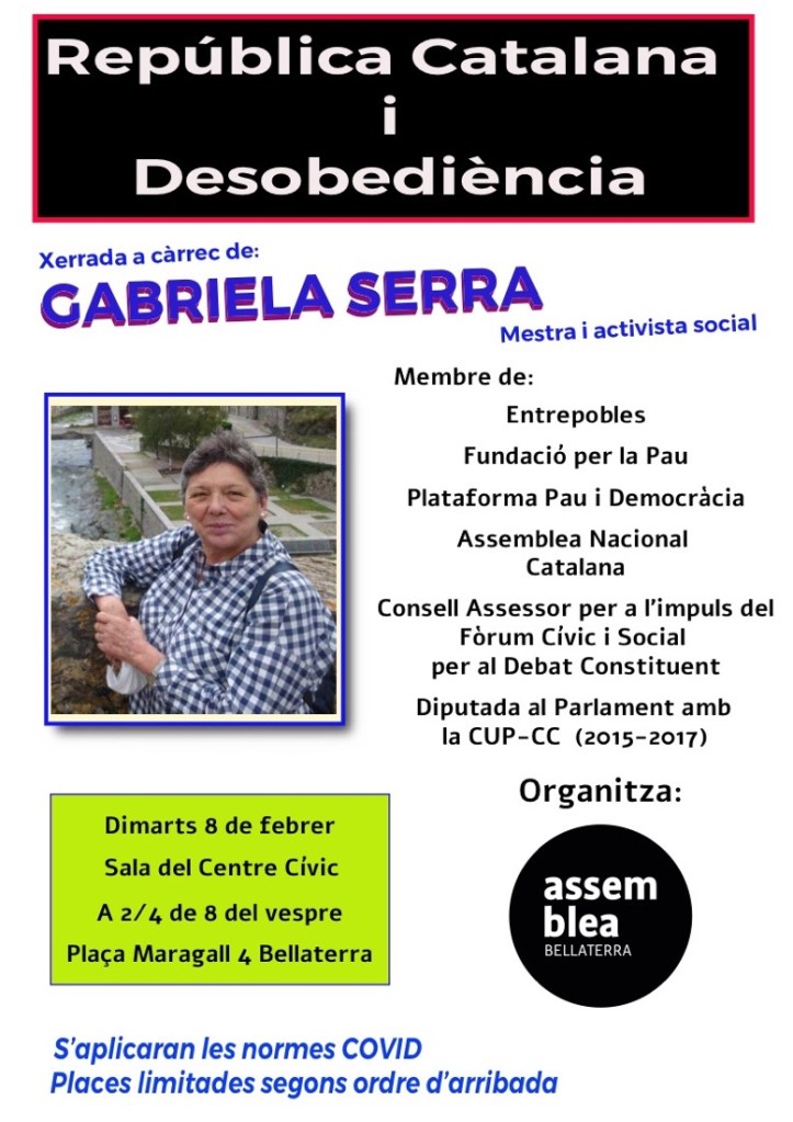 El dimarts 8 de febrer, a Bellaterra, es farà una xerrada sobre la República catalana i la desobediència a càrrec de l’activista Gabriela Serra.