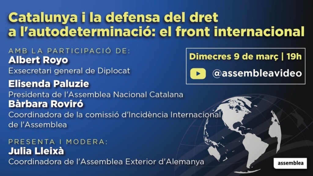 El 9 de març, a les 19.00 h, hi haurà la conferència: “El front internacional de l’ANC en la defensa del dret d’autodeterminació de Catalunya i el paper de la diàspora catalana en aquesta estratègia”. És podrà seguir a YouTube al canal @assembleavideo.