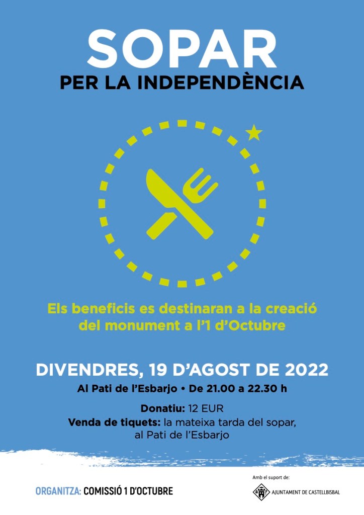 El divendres 19 d’agost, a Castellbisbal, es farà un Sopar per la independència. L’acte començarà a les 21.00 al Pati de l’Esbarjo. Els beneficis es destinaran a la creació del monument a l’1 d’Octubre.