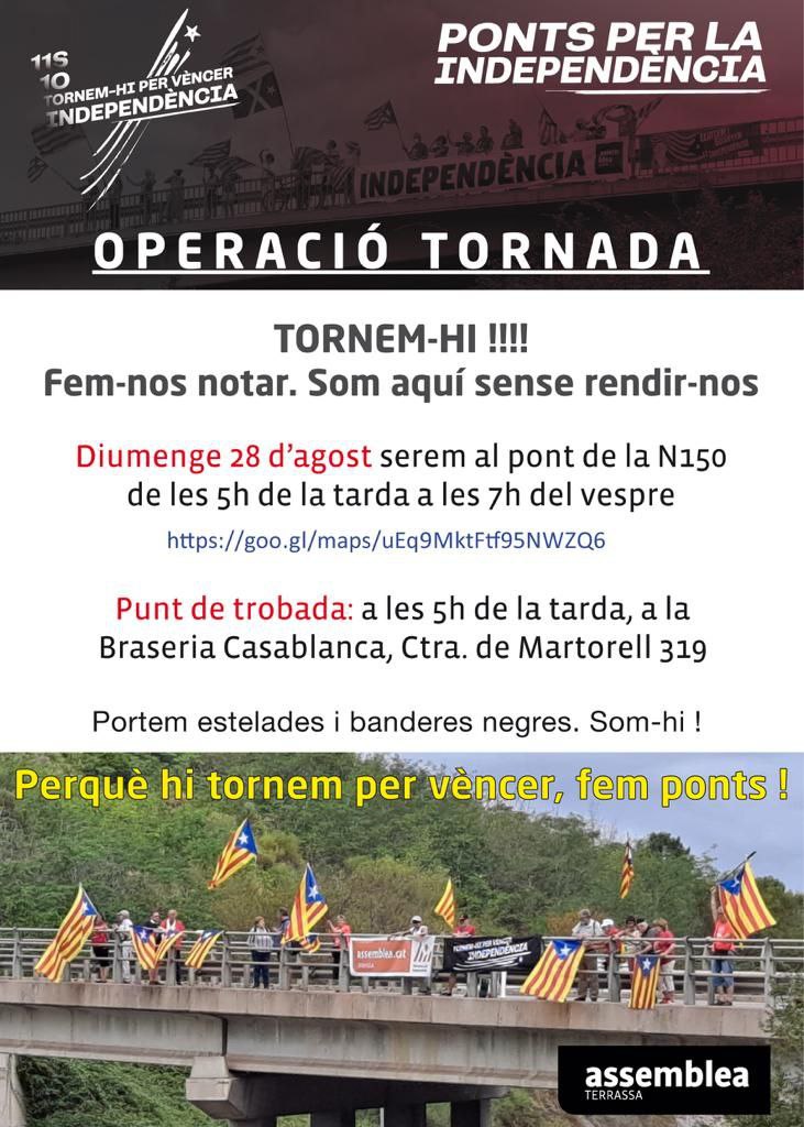 ag. 26 2022 28 d’agost, a Terrassa, Ponts per la independència Aquest diumenge 28 d’agost, a Terrassa, es tornaran a fer els Ponts per la independència. El punt de trobada serà a les 17.00 h, a la braseria Casablanca, carretera de Martorell, 319. Feu clic per enviar un enllaç per correu electrònic a un amic (S'obre en una nova finestra) Correu electrònic Feu clic per compartir al Facebook (S'obre en una nova finestra) Facebook Feu clic per compartir a X (S'obre en una nova finestra) X Feu clic per compartir al WhatsApp (S'obre en una nova finestra) WhatsApp Feu clic per compartir al Telegram (S'obre en una nova finestra) Telegram Feu clic per compartir al Mastodon (S'obre en una nova finestra) Mastodon Més Feu clic per imprimir (S'obre en una nova finestra) Imprimeix Fes clic per compartir al Linkedin (S'obre en una nova finestra) LinkedIn Feu clic per compartir al Tumblr (S'obre en una nova finestra) Tumblr Feu clic per compartir al Pinterest (S'obre en una nova finestra) Pinterest Fes clic per compartir al Reddit (S'obre en una nova finestra) Reddit Feu clic per compartir al Pocket (S'obre en una nova finestra) Pocket M'agrada S'està carregant... Relacionats