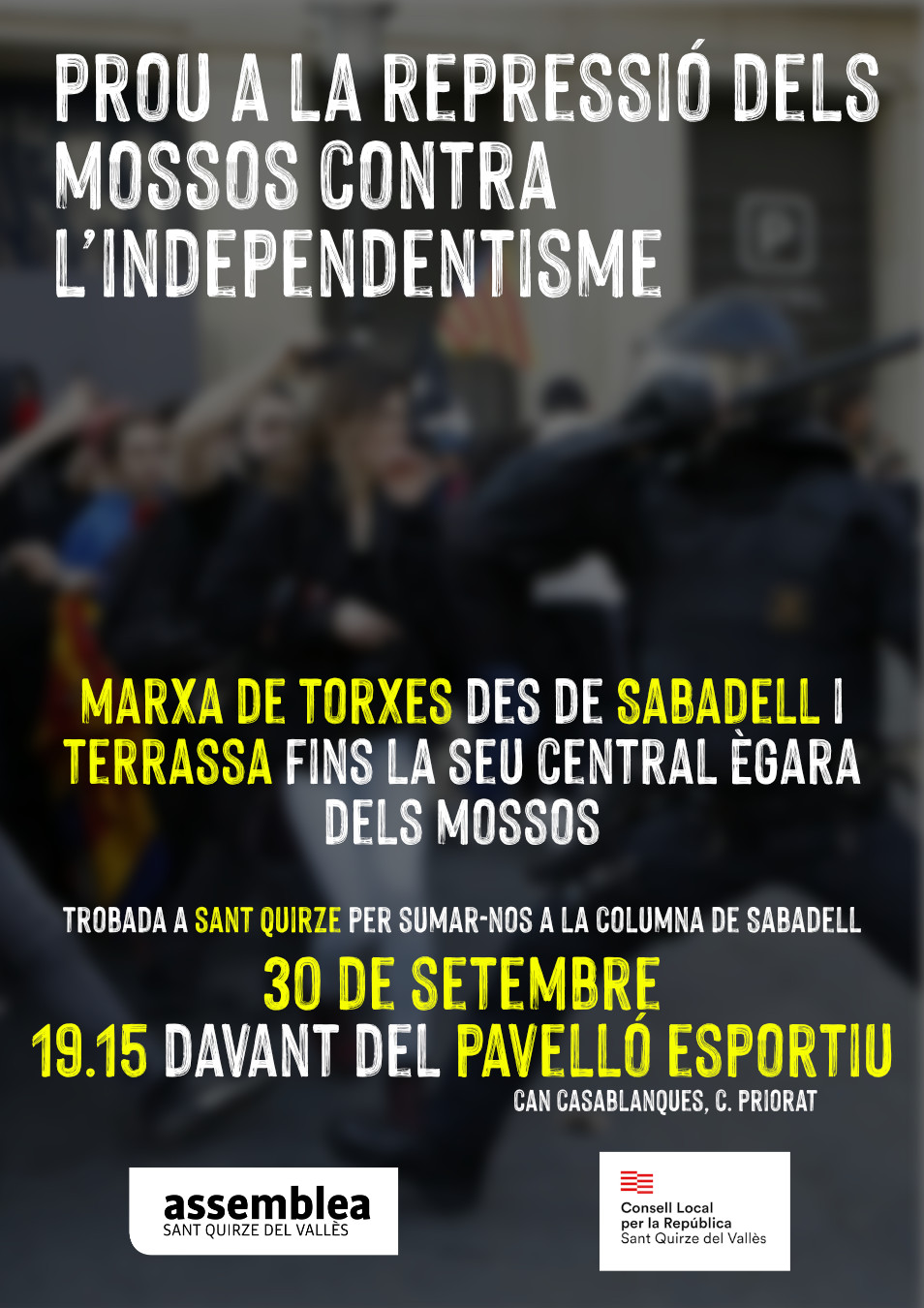 El divendres 30 de setembre, ens concentrarem a 19.15 h, davant del pavelló esportiu de Can Casablanques, per anar junts a l’inici de la columna de Sabadell de la marxa de torxes en contra de la repressió dels Mossos a l’independentisme.