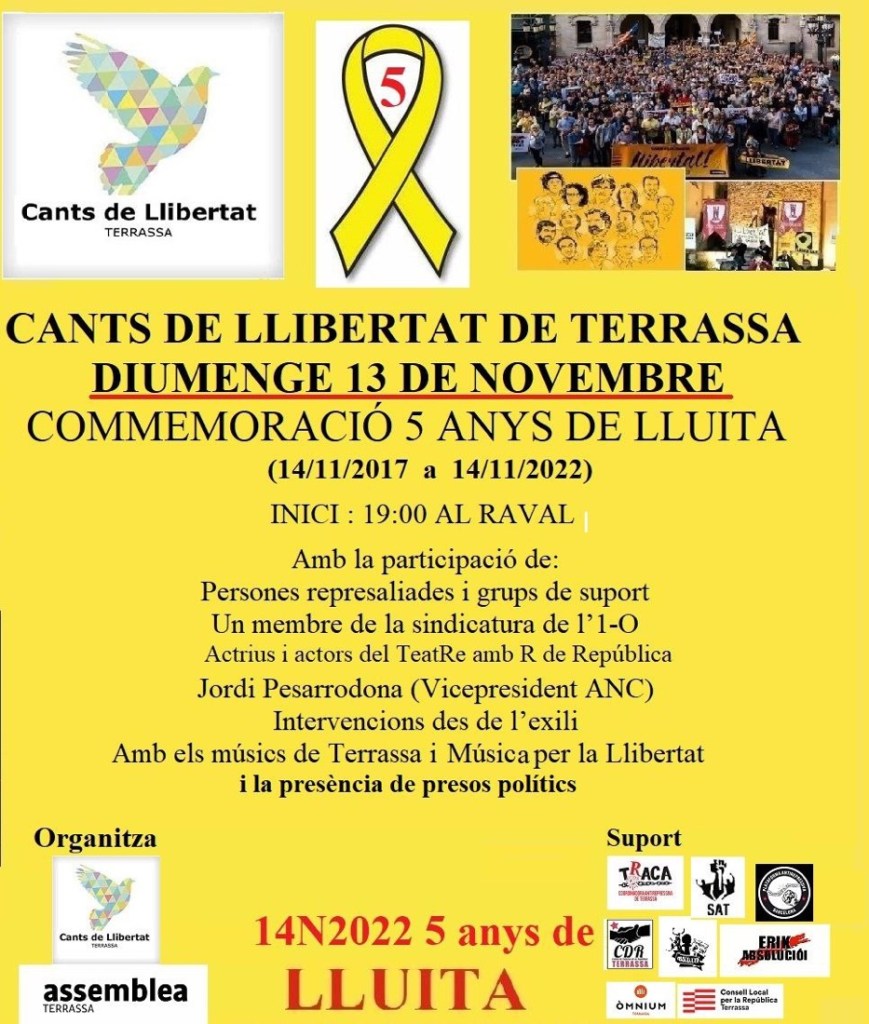 El diumenge 13 de novembre, a Terrassa, es farà un acte de commemoració dels 5 anys dels Cants de llibertat.