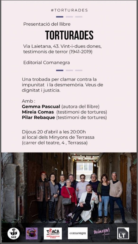 El dijous 20 d’abril, a Terrassa, es presentarà el llibre “Torturades“ amb la presència de l’autora, Gemma Pascual i de dues de les dones testimoni de les tortures.