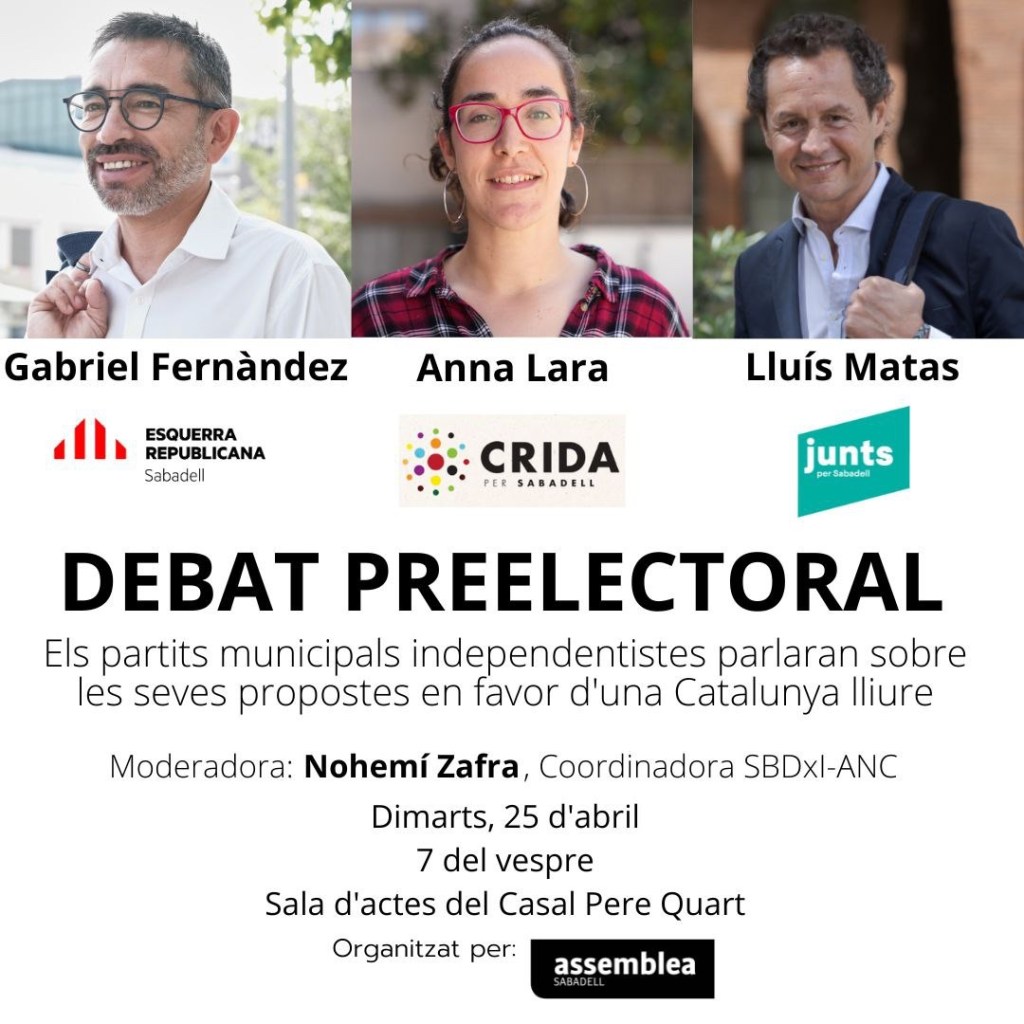El proper dimarts 25 d’abril, a les 7 del vespre, celebrarem un debat preelectoral amb els partits independentistes de Sabadell per conèixer de quina manera poden contribuir a la independència des de l’àmbit municipal.