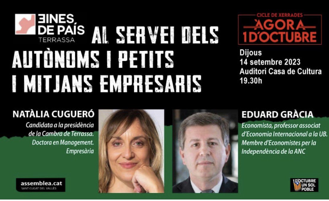 El dijous 14 de setembre, a Sant Cugat del Vallès, es farà la presentació de la candidatura Eines de país a la cambra de Terrassa. Hi participaran Natàlia Cugueró, candidat a la presidència, i l’economista Eduard Gràcia.