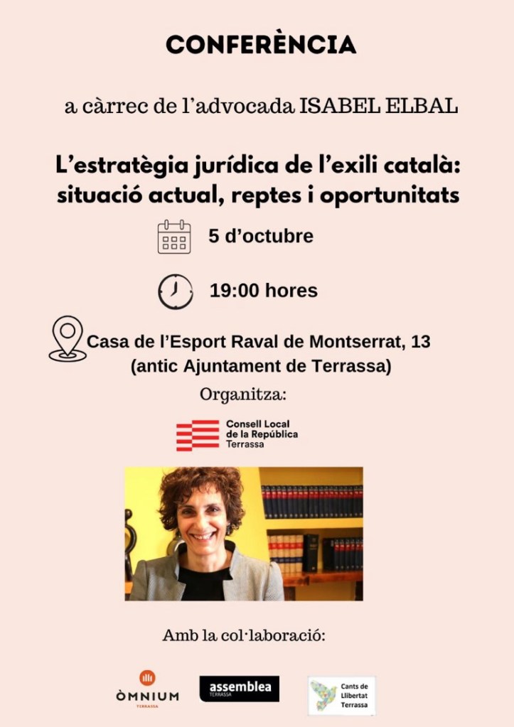 El dijous 5 d’octubre, s Terrassa, es farà la conferència de l’advocada Isabel Elbal “L’estratègia jurídica de l’exili català: situació actual, reptes i oportunitats“.