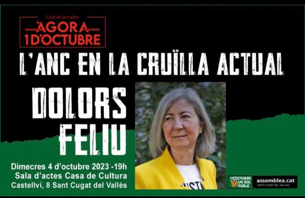 El dimecres 4 d’octubre, de Sant Cugat del Vallés, la presidenta de l’Assemblea Nacional Catalana, Dolors Feliu, farà una conferència sobre l’Assemblea en la cruïlla actual.