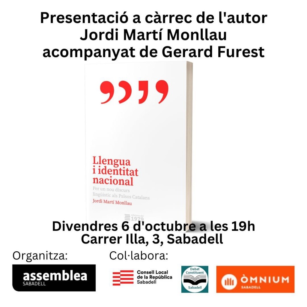 El proper divendres 6 d’octubre, a Sabadell, es presentarà el llibre ‘Llengua i identitat nacional. Per un nou discurs lingüístic als Països Catalans‘, amb el seu autor, en Jordi Martí Monllau a qui acompanyarà en Gerard Furest.