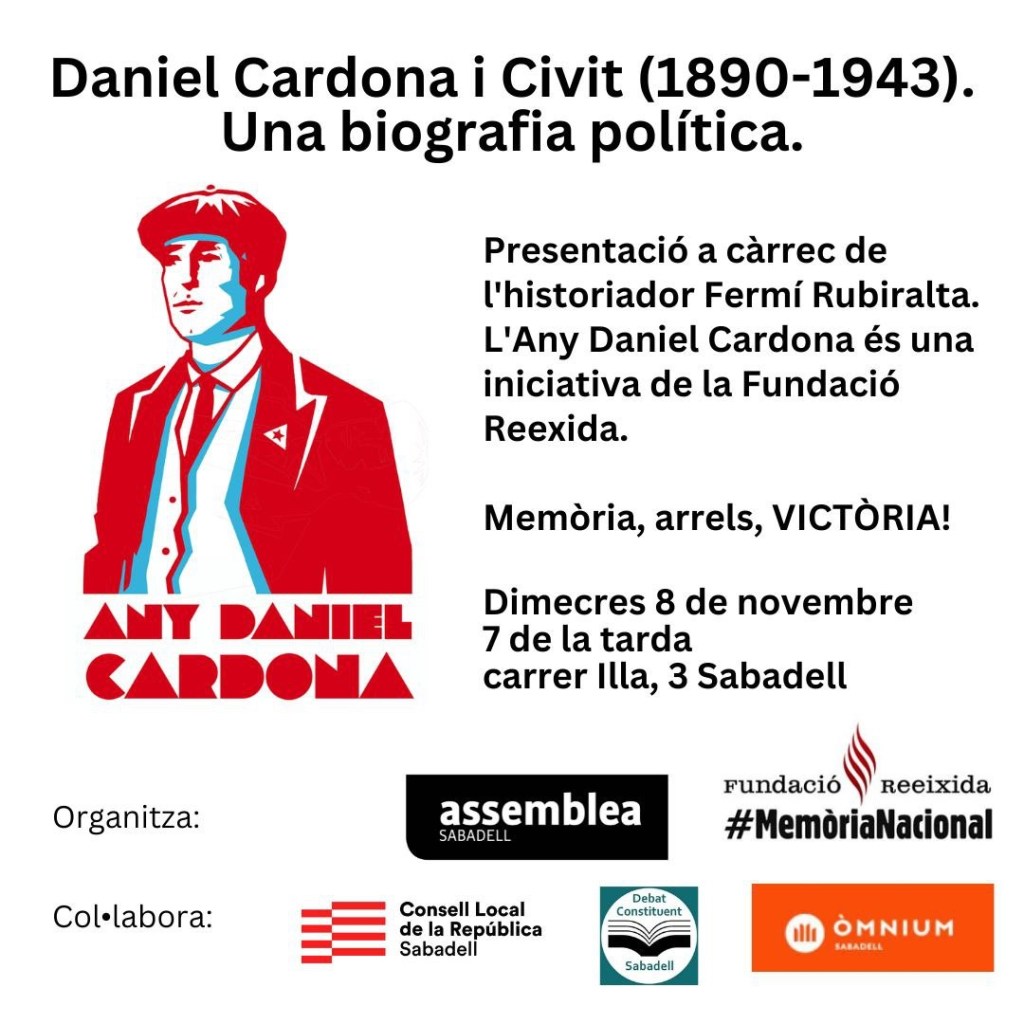 El proper dimecres 8 de novembre, a Sabadell, coneixerem la figura de Daniel Cardona, qui pot ser considerat, juntament amb Francesc Macià, el dirigent històric més rellevant de l’etapa inicial del moviment independentista.