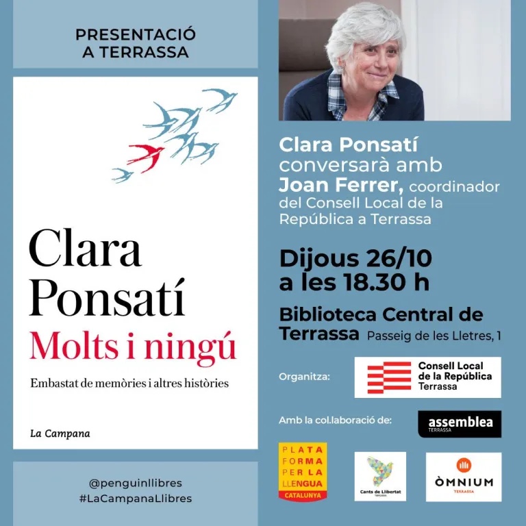 El dijous 26 d’octubre, a Terrassa, Clara Ponsetí presentarà el seu llibre “Molts i ningú“ en conversa a Joan Ferrer, coordinador del Consell per la República de Terrassa.