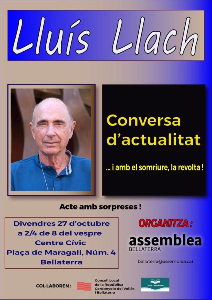 Tenim el goig d’invitar-vos a l’acte que hem preparat per a aquest mes d’octubre i que ja us vàrem avançar a la Tertúlia de final de setembre: Conversa d’actualitat amb Lluís Llach,… i amb el somriure, la revolta. A més del luxe de poder escoltar i conversar amb en Lluís, us prometem unes sorpreses per a ell i per a tots nosaltres que segur que us agradaran. Heu de venir, però, si voleu saber de què es tracta…
