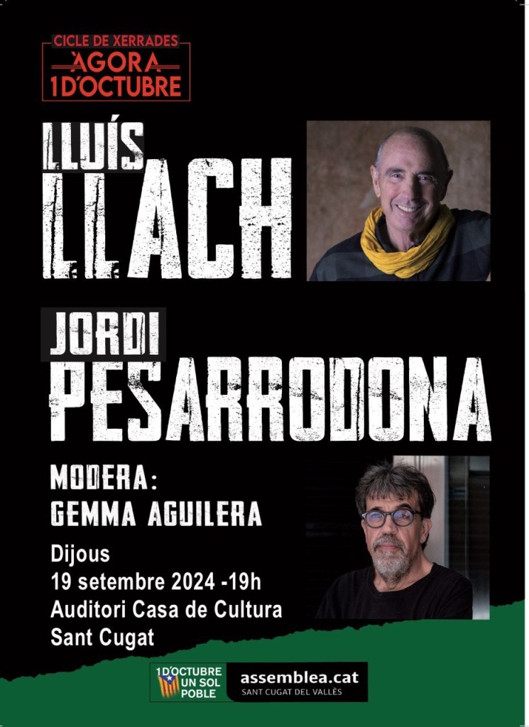 El dijous 19 de setembre, a Sant Cugat del Vallès, es farà un acte més del cicle Àgora 1 d’Octubre amb la participació de Lluís Llach i de Jordi Pesarrodona.