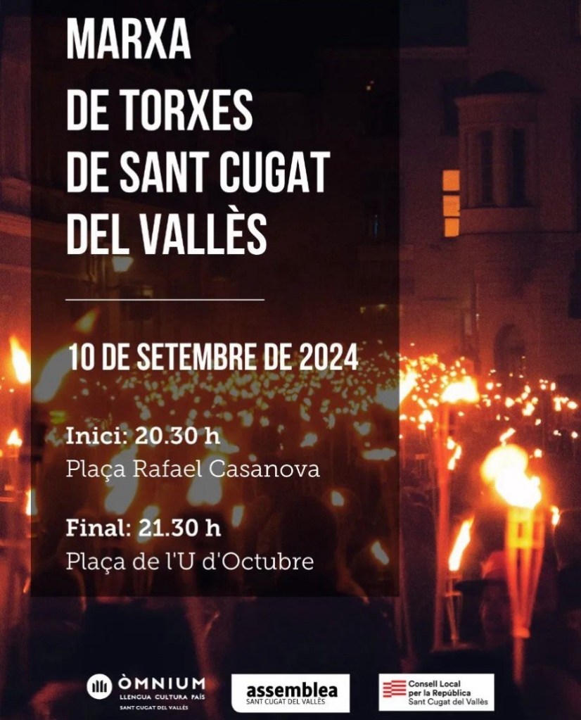 El 10 de setembre Òmnium Sant Cugat, l’ANC i el Consell per la República convoquem la Marxa de Torxes per reivindicar el valor de les persones que han lluitat des de la derrota de 1714, per la plena recuperació de les llibertats nacionals. La marxa, així, s’afegeix a les que se celebren arreu de Catalunya, pel dret a la independència.