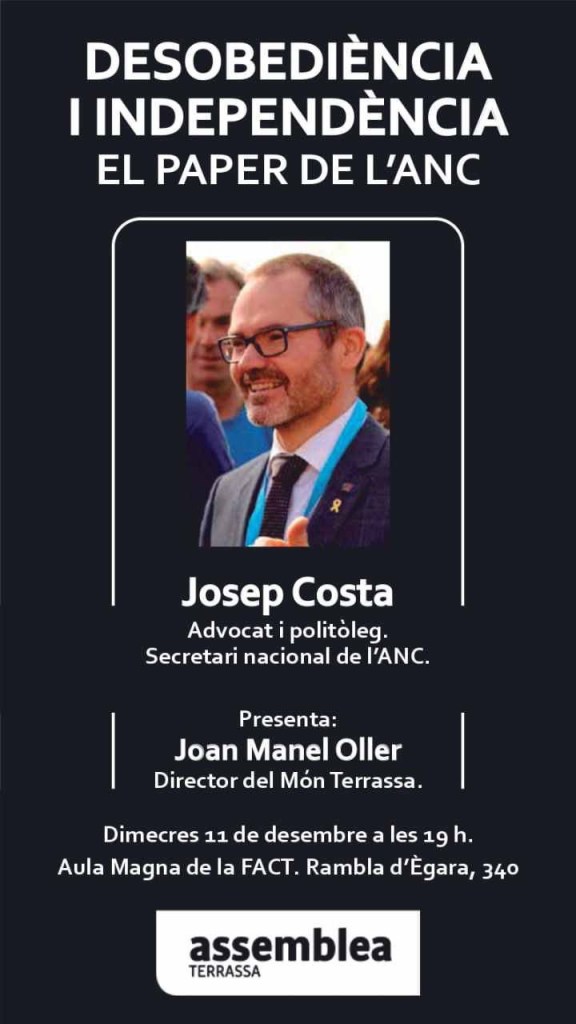 El dimecres 11 de desembre, a Terrassa, es farà a la xerrada “Desobediència i independència, el paper de l’ANC“ amb Josep Costa.