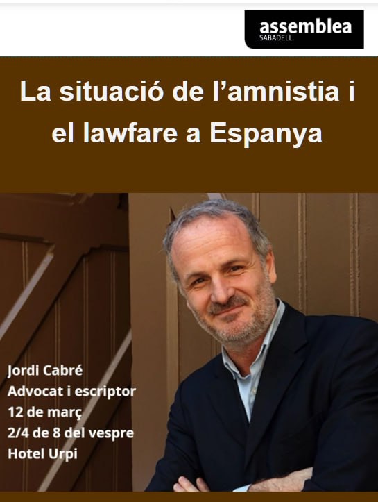 El pròxim 12 de març, Jordi Cabré oferirà una xerrada organitzada per Sabadell per la Independència-ANC on abordarà el tema de la situació de l’amnistia i la lowfare a Espanya. Ens informarà sobre la situació jurídica i política de l’amnistia i dels treballs sobre l’adjudicació de l’amnistia als exiliats.