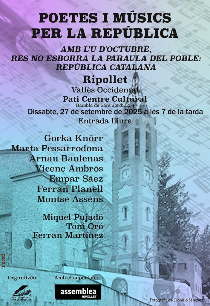 El dissabte 27 de setembre, a Ripollet, es farà l’acte ‘Poetes i músics per la República’ en commemoració de l’U d’Octubre.
