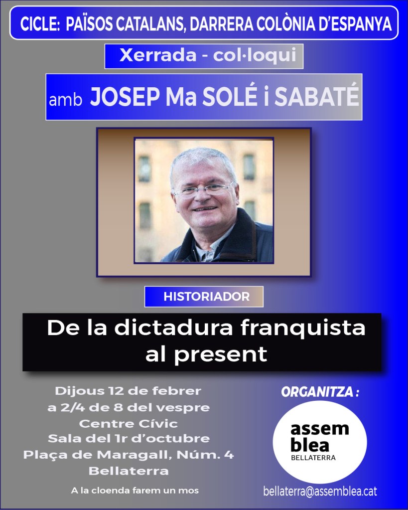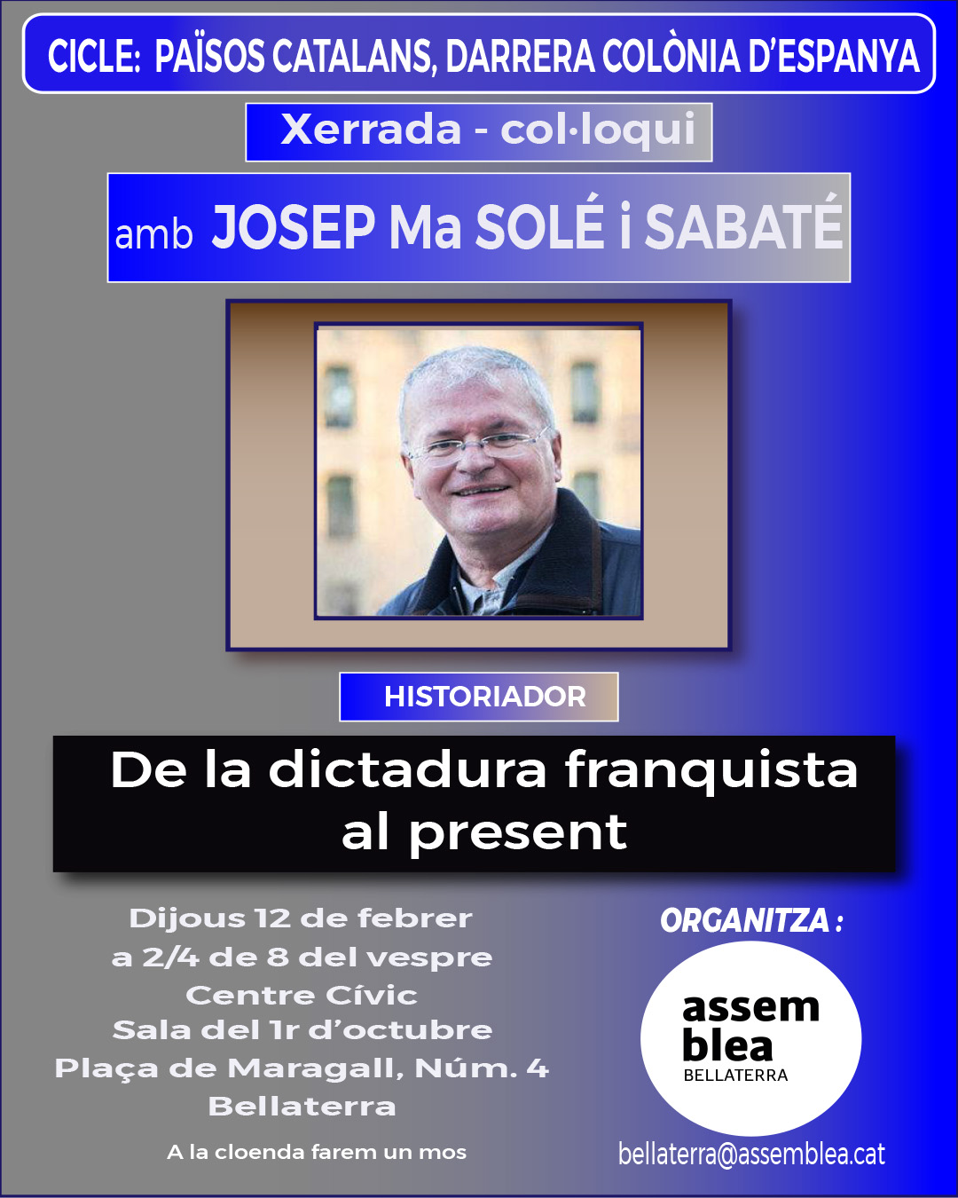 Aquest dijous dia 12 a dos quarts de vuit (7:30) tenim el 3r acte del Cicle “Països Catalans, darrera colònia d’Espanya”, la 2a xerrada de l’historiador Josep Mª Solé i Sabaté que ara ens parlarà de la història que ens és més propera “De la dictadura franquista al present”.