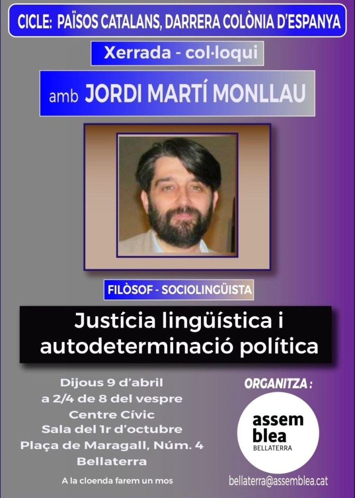 El proper dijous 9 d’abril, el filòsof i sociolingüista Jordi Martí Monllau membre actiu del grup Koiné, ens parlarà de la llengua catalana dins el tema “Justícia lingüística i autodeterminació”.