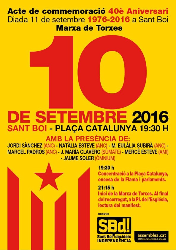 Sí que assistirem a l’acte commemoratiu que l’Assemblea Territorial de Sant Boi farà organitza el dia 10 de setembre a les 19:30 a la plaça Catalunya de Sant Boi, amb la presència d’en Jordi Sànchez i de la resta de càrrecs orgànics de l’ANC així com representants de Súmate, Omnium Cultural i l’AMI. Trobareu el cartell a continuació.