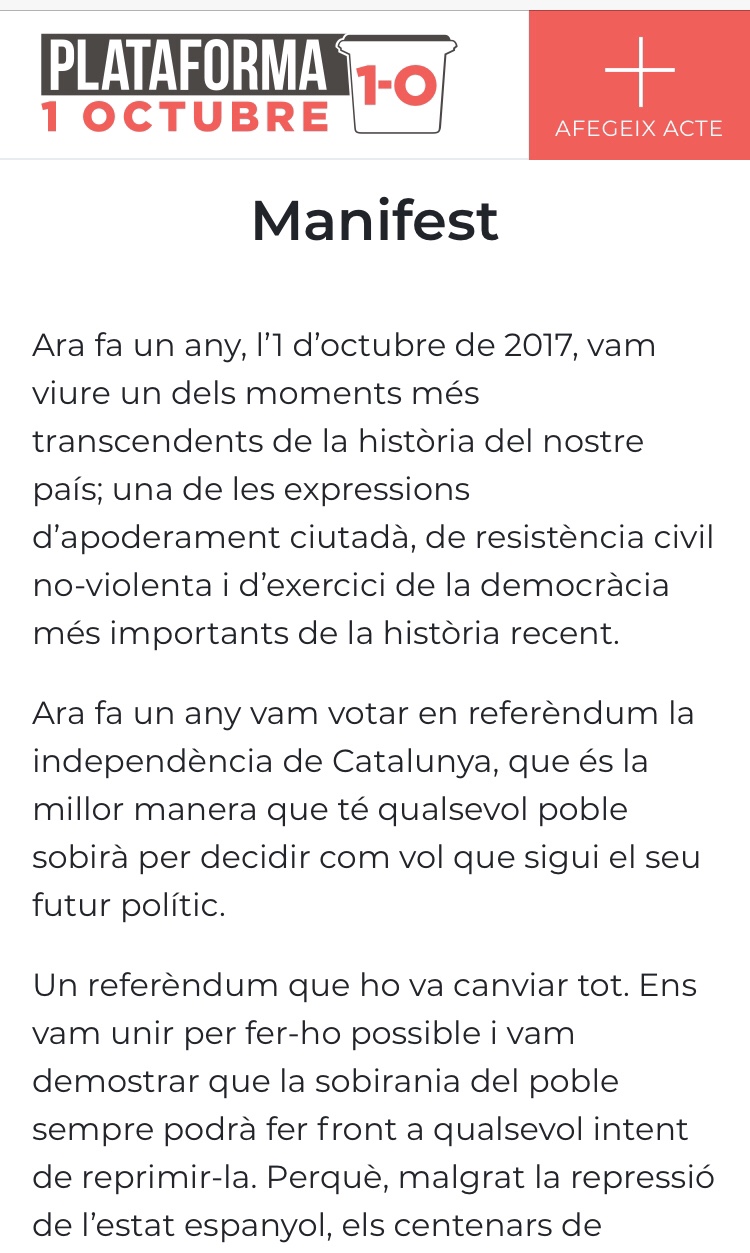 El primer gran acte serà el proper 16 de febrer, dia que s’ha convocat una gran mobilització que recorrerà la Gran Via de Barcelona a les 17 h, des de plaça Espanya fins a plaça Universitat. Un mes després, la tarda del 16 de març, també es preveu una mobilització massiva. Aquest cop, però, a Madrid, a les 18 h.