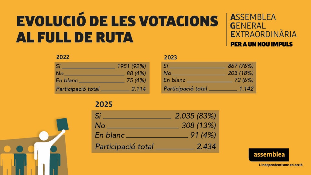 L’Assemblea General Extraordinària (AGE), que s’ha celebrat del 15 al 19 de gener de forma telemàtica, ha conclòs amb l’aprovació del nou Full de ruta de l’entitat. Els socis de l’Assemblea Nacional Catalana (ANC) han rebutjat totes les esmenes vives i han avalat el nou document amb el 83% dels vots a favor.El 13% hi ha votat en contra i un 4% en blanc. La participació en la votació delFull de ruta definitiu ha estat de 2.434 socis, un 113% més respecte al 2023 i un 15% més que el 2022.
