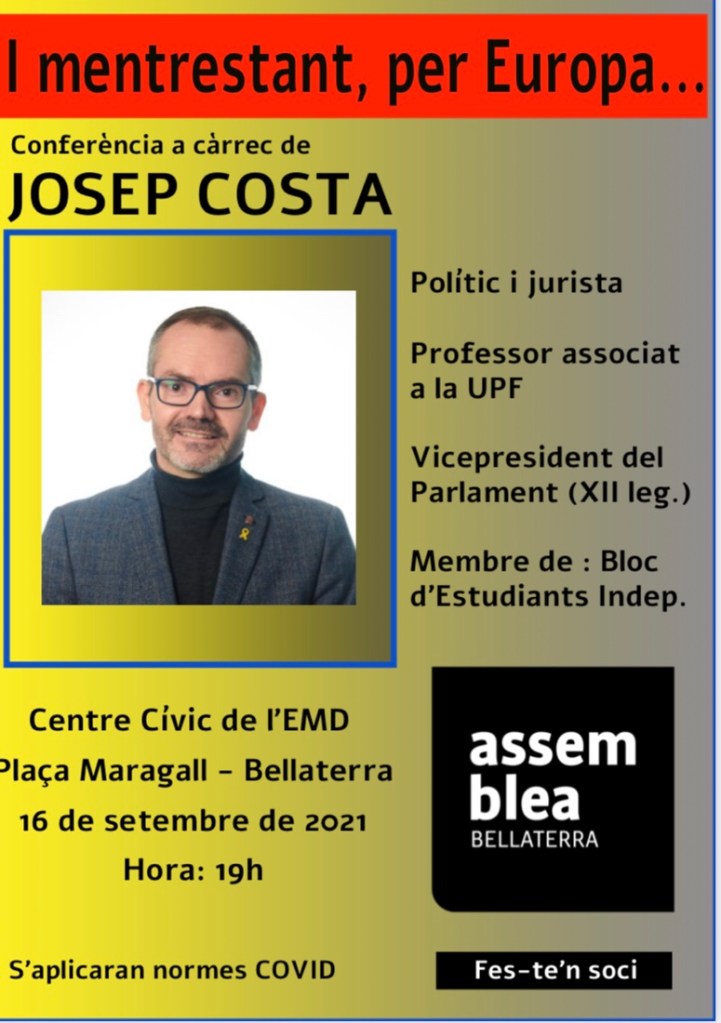 El dijous 16 de setembre, a Bellaterra, l’exdiputat Josep Costa farà una conferència titulada “i mentrestant, per Europa… “.
