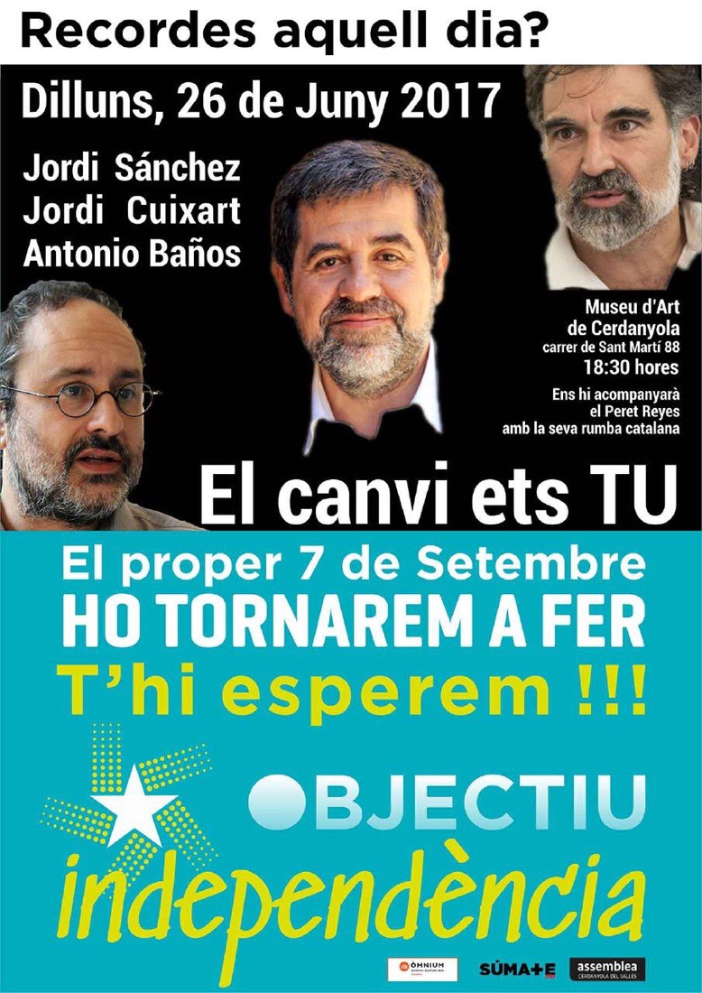 El dissabte 7 de setembre, a Cerdanyola del Vallès, acte “Recordes aquell dia? Ho tornarem a fer ” amb Jordi Cuixart, Jordi Sànchez i Antonio Baños.
