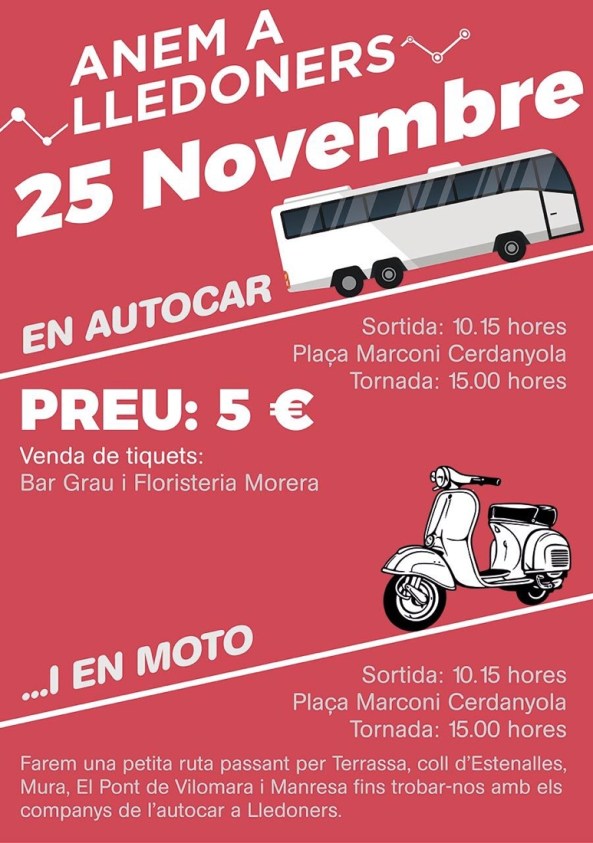 El diumenge 25 de novembre s’organitza un autocar des de Cerdanyola del Vallès cap a la presó de Lledoners. També es farà una sortida en moto col·lectiva.