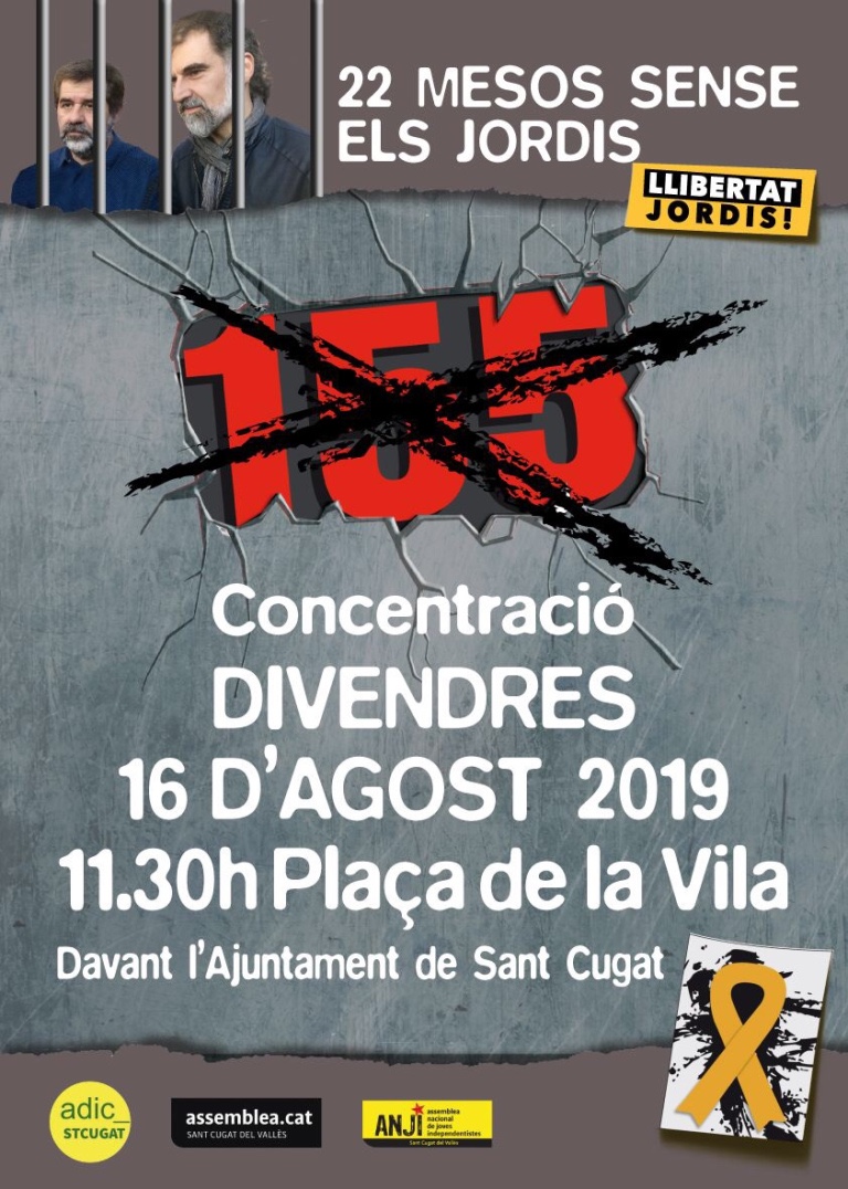 El divendres 16 d’agost, a Sant Cugat del Vallès, es farà una concentració en motiu dels 22 mesos de presó de Jordi Sànchez i Jordi Cuixart.