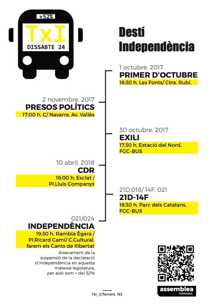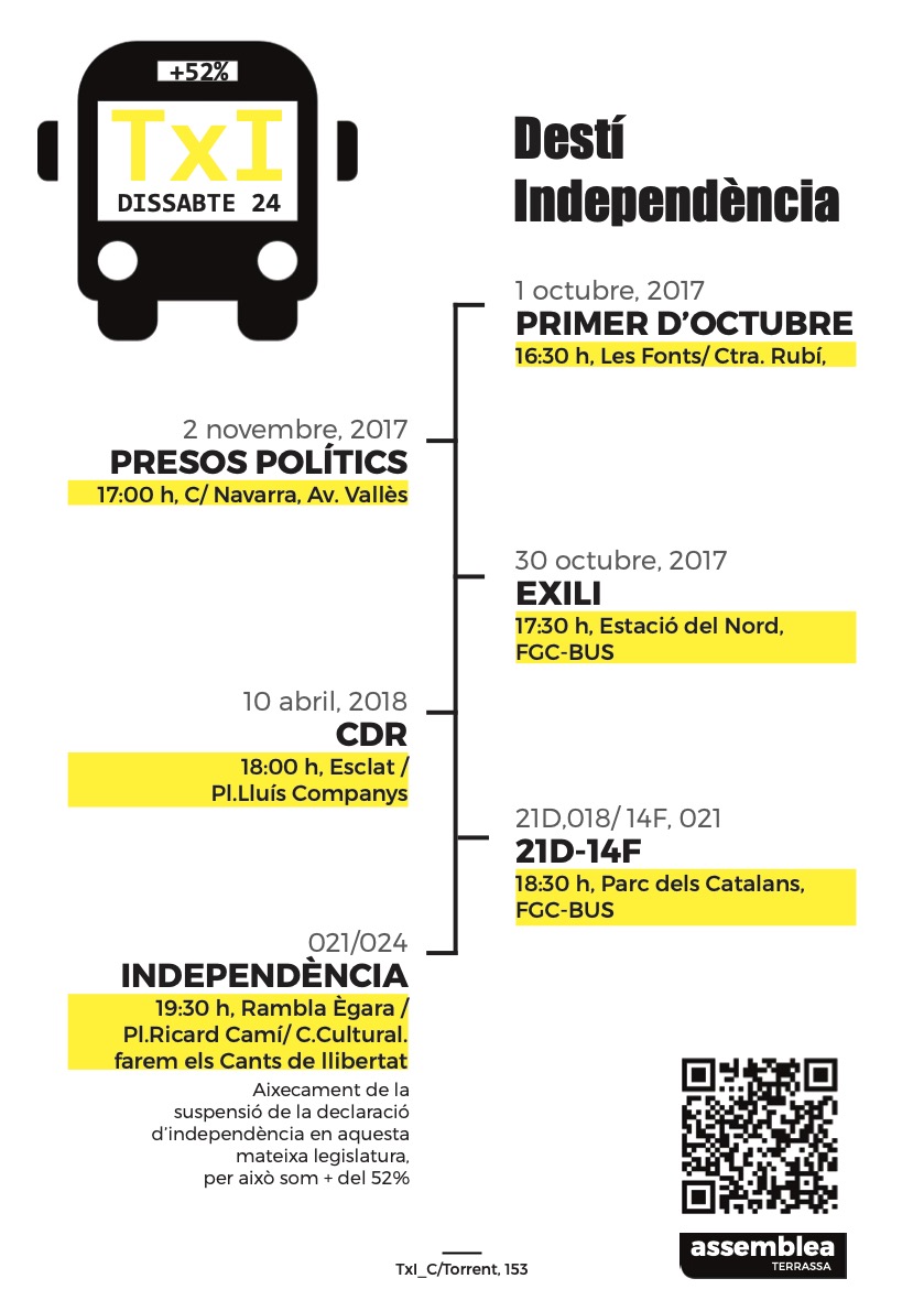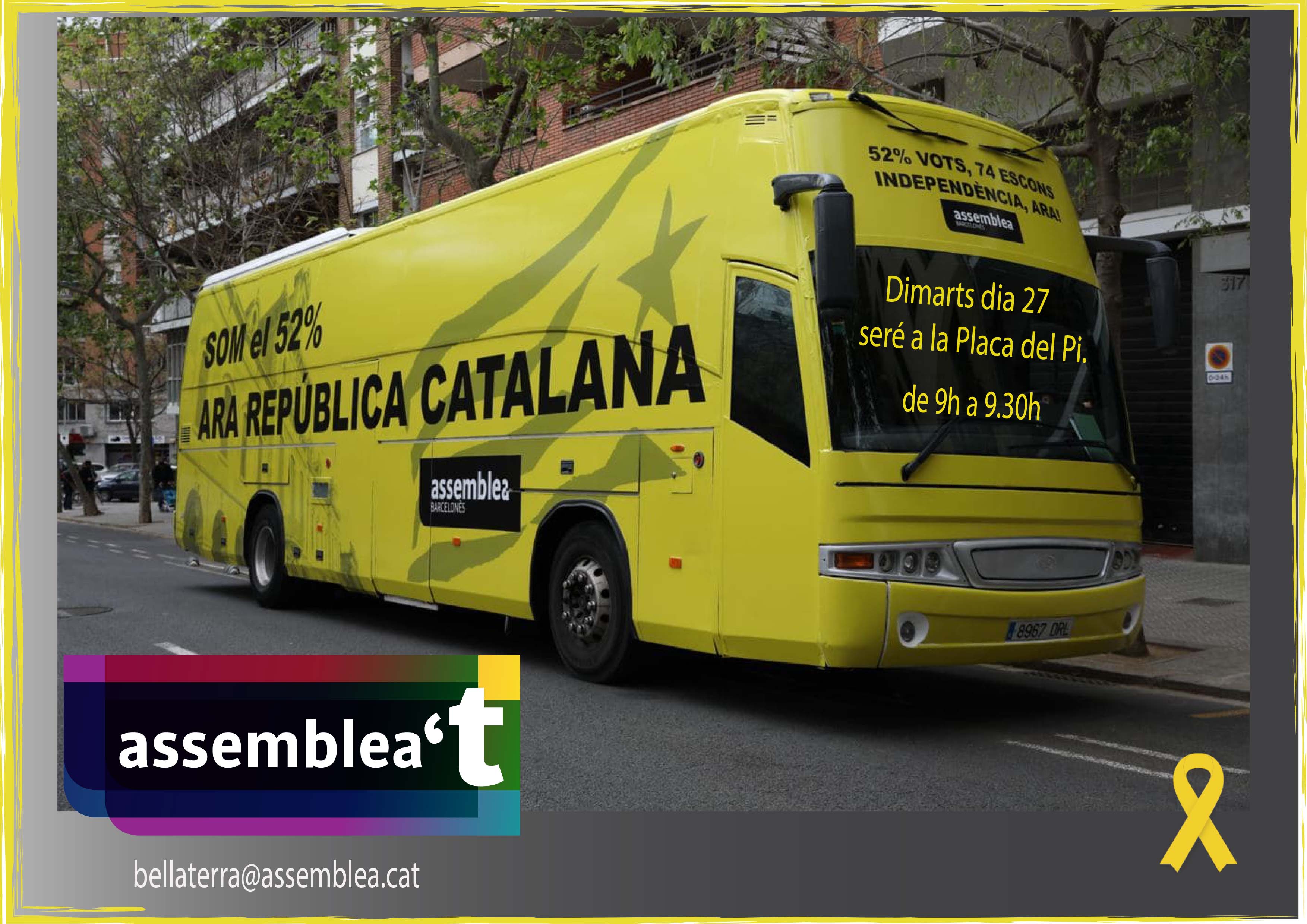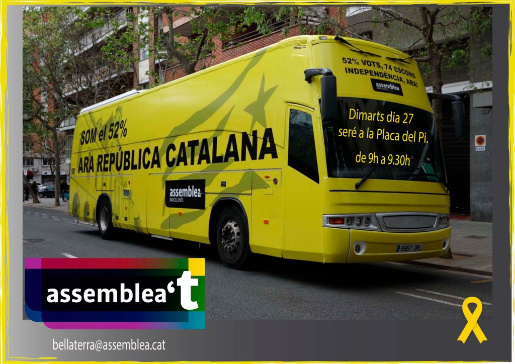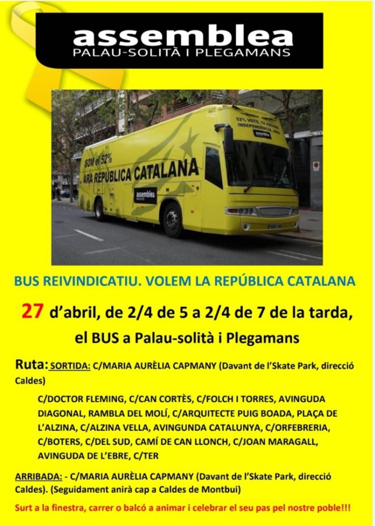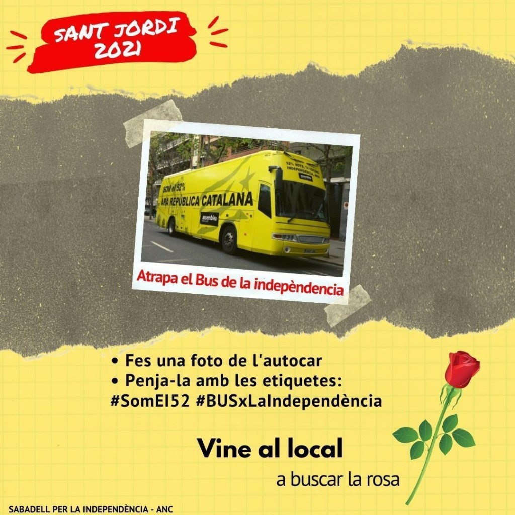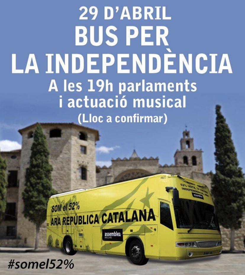 A partir del dia de Sant Jordi i durant una setmana serà possible veure el Bus per la independència al Vallès Occidental. Aquest autobús porta impresos els missatges relacionats amb els resultats de les passades eleccions al Parlament de Catalunya: “Som el 52%. Ara República Catalana” i “52% dels vots, 74 escons: independència ara“. per reivindicar la majoria independentista de vots i demanar un Govern per fer front a la urgència social i nacional, i que faci acció independentista.