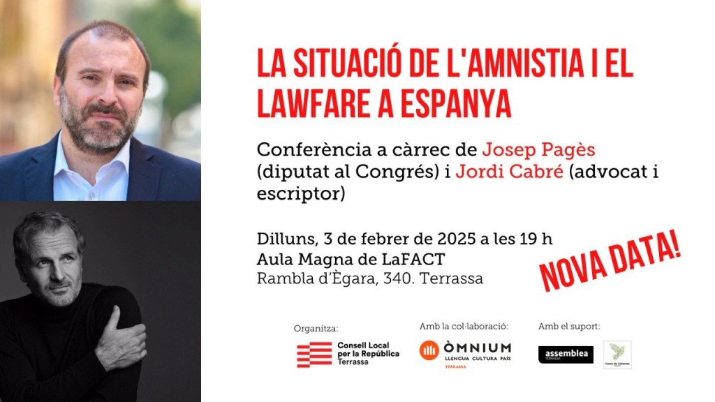 El pròxim 12 de març, Jordi Cabré oferirà una xerrada organitzada per Sabadell per la Independència-ANC on abordarà el tema de la situació de l’amnistia i la lowfare a Espanya. Ens informarà sobre la situació jurídica i política de l’amnistia i dels treballs sobre l’adjudicació de l’amnistia als exiliats.