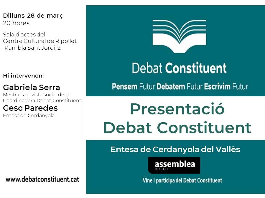 El dilluns 28 de març, a Ripollet, es farà l’acte de presentació de Debat Constituent. A l’acte hi intervindran Gabriela Serra i Cesc Paredes. L’acte començarà a 20.00 a la sala d’actes del Centre Cultural de Ripollet, Rambla Sant Jordi, 2.