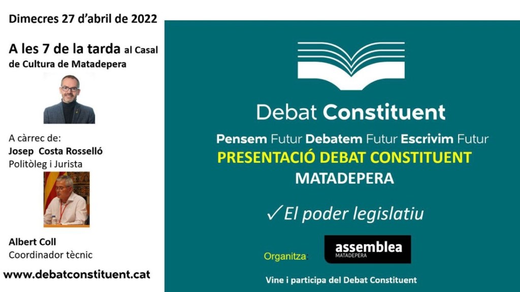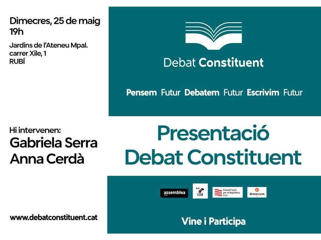 Divendres 25 de març, a les 19:00, al Casal de Torreblanca de Sant Cugat del Vallès, es farà la presentació de Debat Constituent, en un acte organitzat pel Consell Local per la República i Entesa de Cerdanyola del Vallès i la col·laboració de l’Assemblea Nacional Catalana i Òmnium Cultural de Sant Cugat.