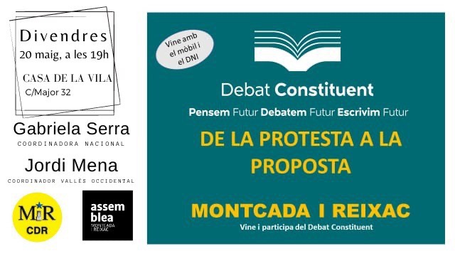 El divendres 20 de maig, a Montcada i Reixac, es farà un acte del Debat Constituent tigulat “De la protesta a la proposta“. Hi participaran Gabriela Serra i Jordi Mena.