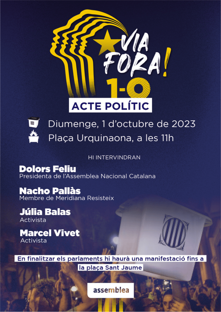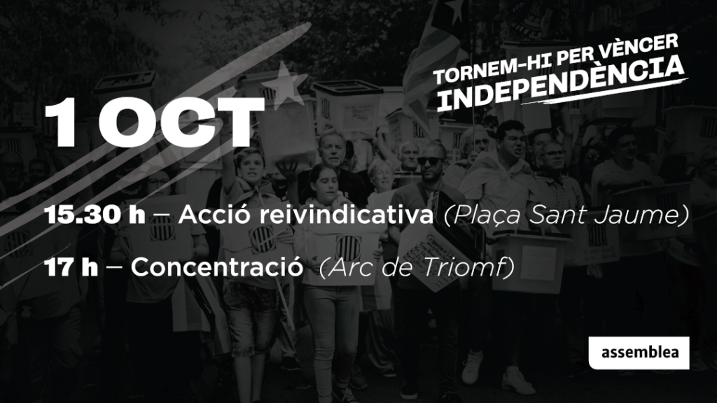 Per això, convoquem a tothom a la plaça d’Urquinaona el dia 1 d’Octubre a un acte que té per objectiu continuar impulsant la mobilització ciutadana: cal que la gent tornem a prendre les regnes i ens preparem novament per un nou i definitiu embat amb l’estat espanyol.