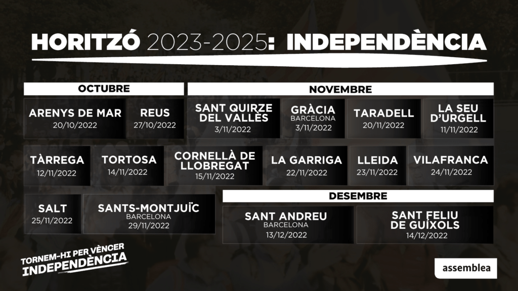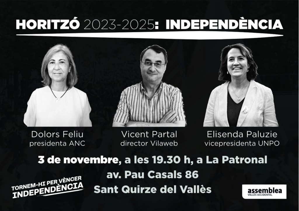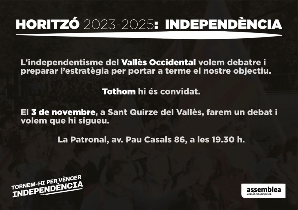 L’Assemblea Nacional Catalana està organitzant el cicle de conferències ‘Horitzó independència: 2023-2025’ a tot Catalunya per donar a conèixer la Conferència Nacional del Moviment Civil Independentista. Aquesta trobada fixarà un horitzó i definirà les condicions necessàries per fer efectiva la declaració d’independència, a més d’identificar quins són els compromisos que cal assumir com a moviment per a fer-la realitat.