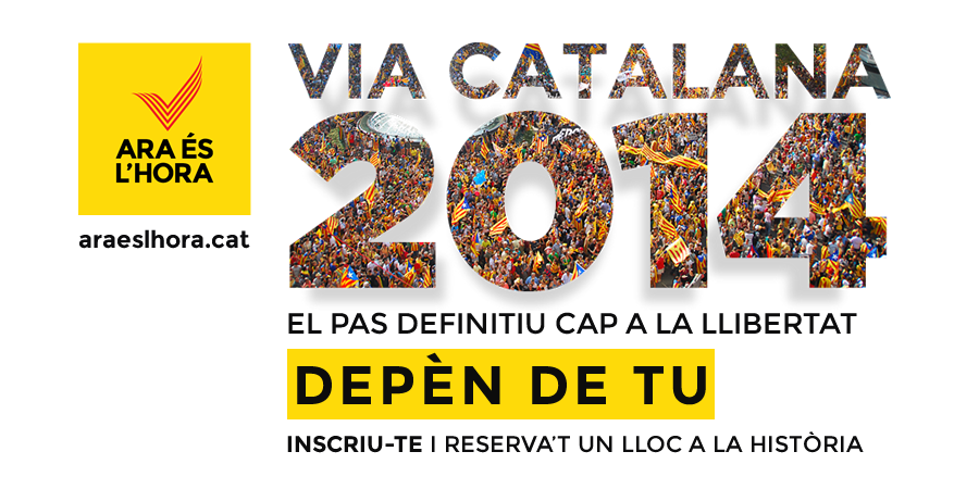 Per assegurar que els 73 trams de la Via estiguin plens, és necessari que la gent s’inscrigui a la web www.araeslhora.cat . És per això que la campanya ARA ÉS L’HORA arrenca el darrer mes amb una crida a fer “el pas definitiu cap a la llibertat” fent la inscripció i participant a la Via 2014.