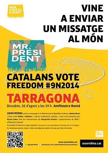Les assemblees territorials de l’ANC de l’Alt Camp, el Baix Camp, la Conca de Barberà, el Priorat i el Tarragonès han organitzat el desplegament d’un gran mural interpel·lant Matteo Renzi, primer ministre italià, per fer-li conèixer que els catalans votaran el proper 9 de novembre. L’acte serà aquest dissabte 16 d’agost a partir de les 19 hores a l’Amfiteatre romà de Tarragona.