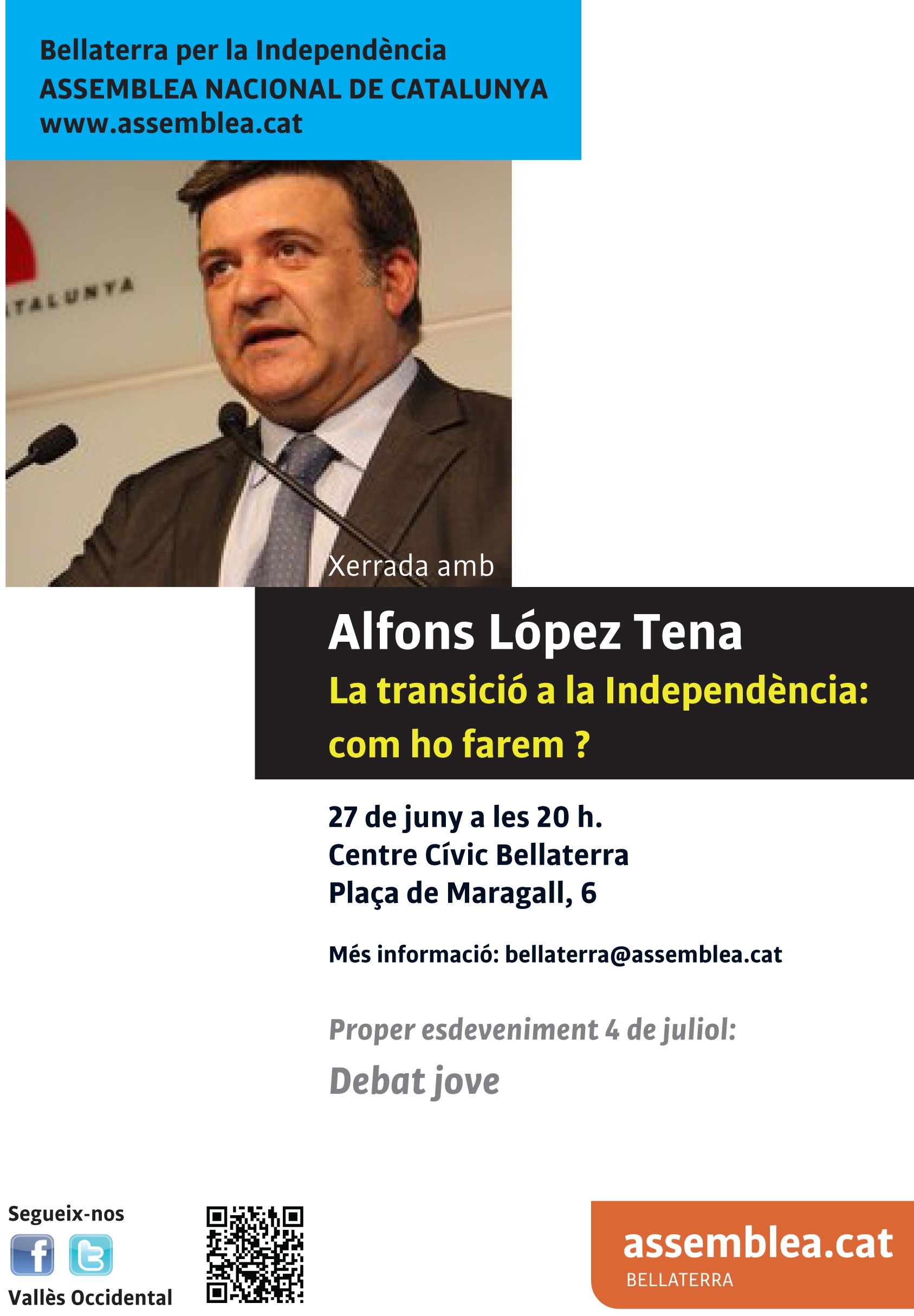 Amb el títol La transició a la independència: com ho farem?  es farà el pròxim  dimecres 27 de juny un acte amb la participació d’Alfons López Tena a Bellaterra. Serà a les 20:00 al Centre Cívic, pl. Maragall 6.