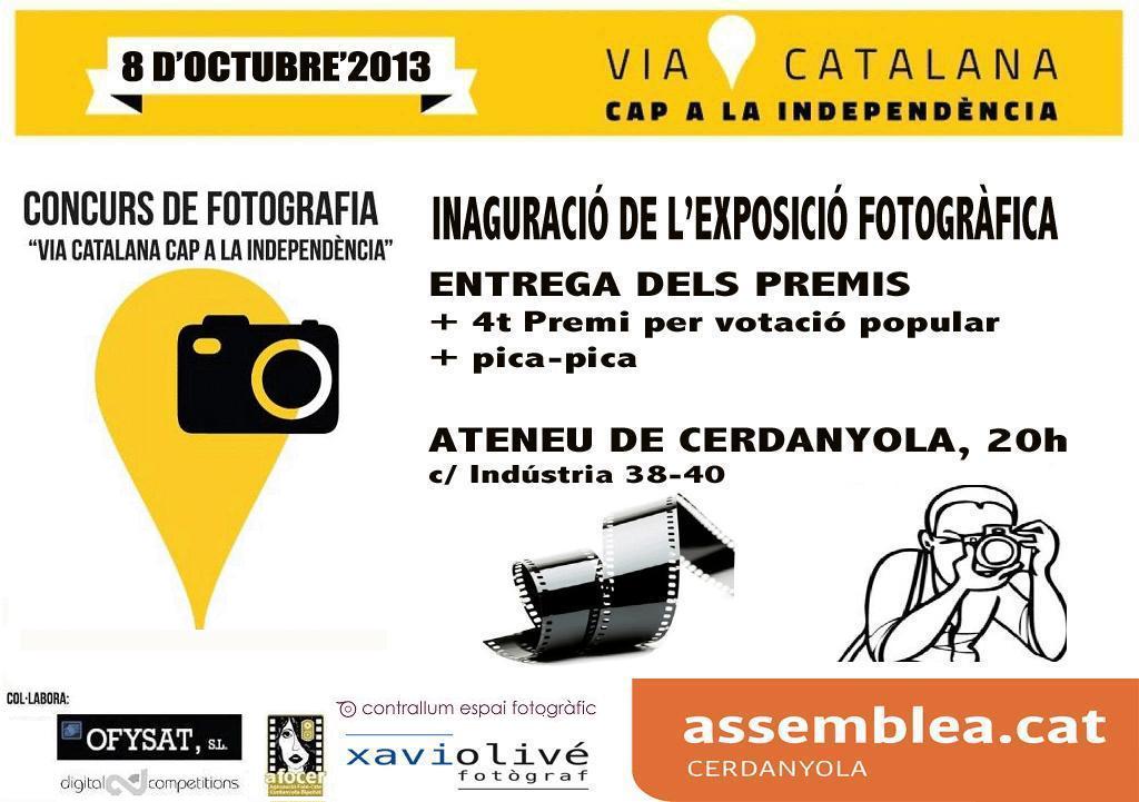 El 8 d’octubre a les 20:00 h es farà la inauguració de l’exposició de fotografia a l’ATENEU de Cerdanyola. També es farà l’entrega dels 3 premis i a més, d’un quart premi popular que es farà per votació aquell mateix vespre. El premi d’aquest 4t premi serà un lot de productes de l’ANC.