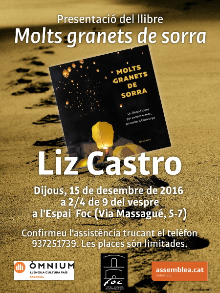 El dijous 15 de desembre, a dos quarts de nou del vespre, es presenta a l’Espai Foc (via Massagué, 5. Sabadell; vegeu el plànol) el llibre de Liz Castro Molts granets de sorra. Atès l’aforament de l’Espai Foc, cal reservar prèviament al telèfon 93 725 17 39.