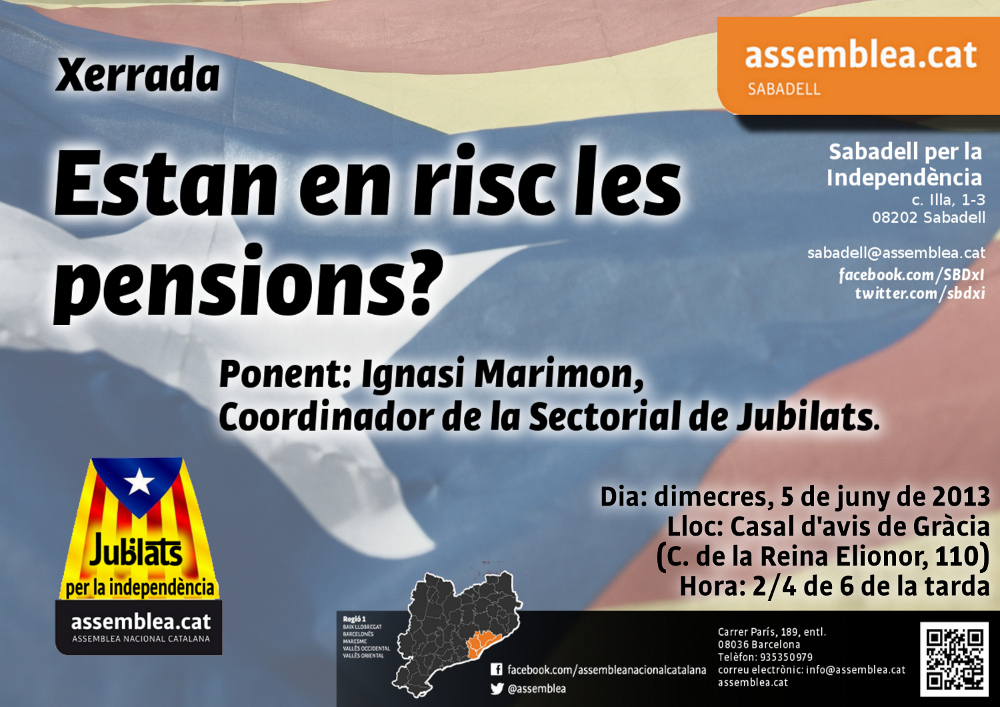 El proper dimecres, 5 de juny, al Casal d’Avis de Gràcia (c. de la Reina Elionor, 110), a 2/4 de 6 de la tarda, organitzem una xerrada que porta per títol Estan en risc les pensions?, a càrrec d’Ignasi Marimon, coordinador de la sectorial de Jubilats per la Independència.